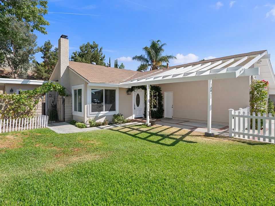 In the beautiful suburbs of Santa Clarita, nestled on a mountain side, cul de sac street, sits a 1780 sqft, 4-bedroom, 2-bathroom single family home. A long driveway and fenced yard leads to the front of this landscaped home and upon entering you are greeted with wood flooring all throughout. A brick fireplace in the family room to give the room that cozy ambiance and a very easy flow to the kitchen. Black countertops with white cabinetry and black fixturing's make it the perfect dynamic for this chic kitchen, giving it that fresh look. A large living room with a built-in cabinet that's flooded with natural lighting makes this space the perfect venue to entertain guest. Access to the backyard that has a fully covered patio and a pool to enjoy a dip during the hot summers of Santa Clarita. Upon right of entry is a room with a closet, that can be used as an office or a gym. Venture further down the hallway and find a bathroom shared by 2 bedrooms, all featuring carpet flooring and built-in closets. A primary bedroom at the end of the hallway with carpet flooring, a built-in closet, and an en suite bathroom. An induvial room following the kitchen with a washer/dryer hookup and home also includes an attached 2 car garage that has access from the front yard.