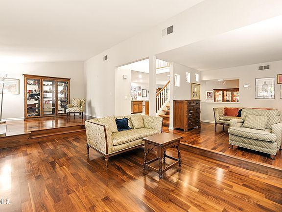 Nestled against a rocky mountain backdrop and surrounded by beautifully landscaped streets, this spacious 4-bedroom, 2.5-bath condominium is located in the highly desirable Rockpointe community of Chatsworth. Offering over 2,000 sq. ft. of living space, the home features a free-flowing layout with a living room, family room, and large dining area. The updated kitchen boasts recessed lighting, custom natural quartz countertops, a striking glass backsplash, and corner cabinets with lazy Susans. All bathrooms have been tastefully updated. Black walnut wood flooring flows throughout the downstairs and staircase, complemented by ceramic tile in the kitchen and bathrooms. The double-door primary suite entry with high ceilings provides an open air retreat. Additional highlights include scraped ceilings, dual pane windows with wood shutters, and closet organizers with built-in shelves and drawers. Two customized private patios offer inviting spaces for outdoor relaxation. The attached 2-car garage and available street parking add convenience, the location is just yards from a hiking trail which enhances the home's appeal. Community amenities include 4 pools, a clubhouse, and lush greenbelts, all near the historic Santa Susana Pass, local parks, transportation, dining, and more.