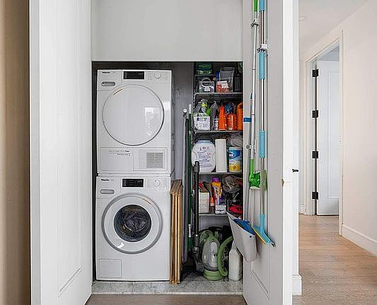 Soaring 10-foot ceilings and floor-to-ceiling Lami windows flood the home with natural light while ensuring energy efficiency with thermal insulation. Interiors are finished with wide-plank white oak floors, multi-zone climate control, and an in-unit Miele washer/dryer.