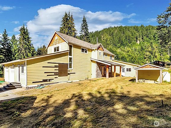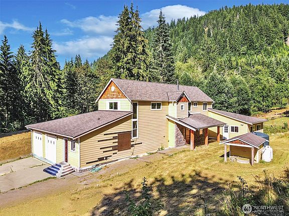 This spacious 5,140 sq ft home sits on 5 private acres and offers a rare opportunity to bring your vision to life. 4 bedrooms, 3.5 baths, and a layout full of possibility, this home is unfinished and ready for your custom touches. Bonus room. private office, open-concept living room with a see-through gas fireplace, formal dining room, upstairs recreation room, potential ADU (Accessory Dwelling Unit) for added income or guest quarters. The serene setting includes space for animals, a year-round creek, and room to host large gatherings in the peaceful outdoors. Just minutes from downtown Granite Falls. This property is being sold as-is and is perfect for an investor or investment group looking for a unique project in a desirable area.