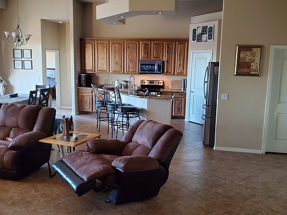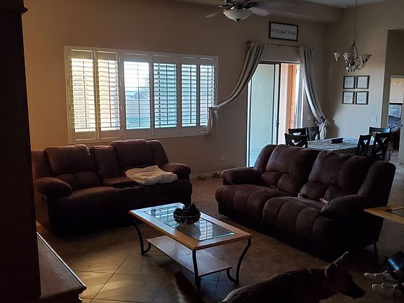 It is a beautiful semi-custom built home with many upgraded amenities, such as granite counter tops, stainless appliances, and NEW wood tile in all bedrooms. On exterior of home is a block wall fence surrounding the whole property which is a huge bonus! Beautiful mountain views! It is a very large house both in size and in feel. It will comfortably become a home for a family who have furry family members. There are no constraints for animals.