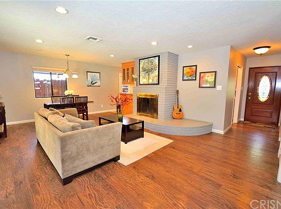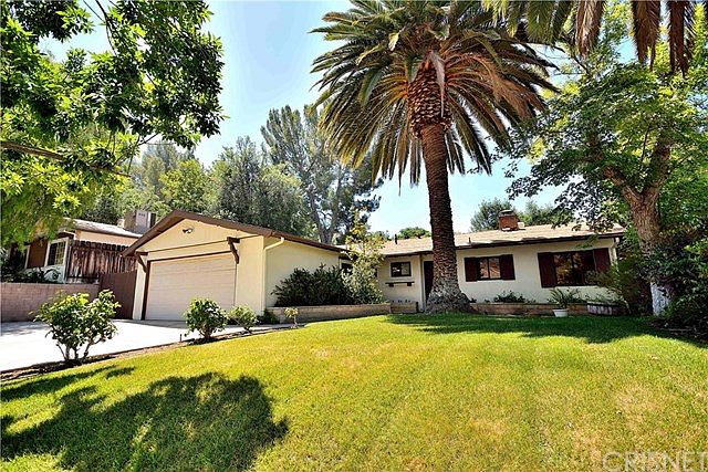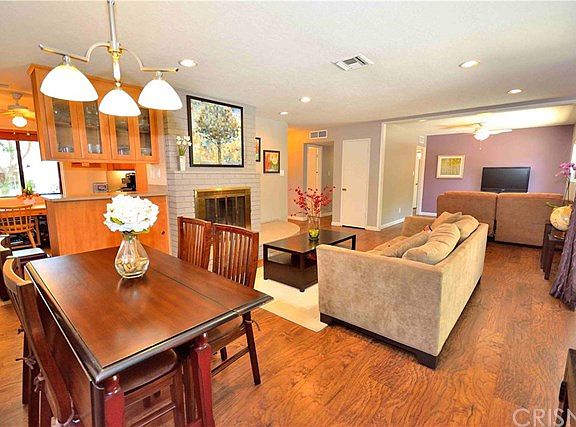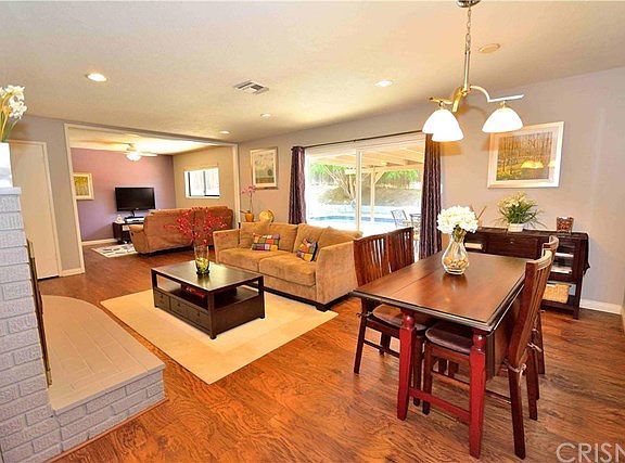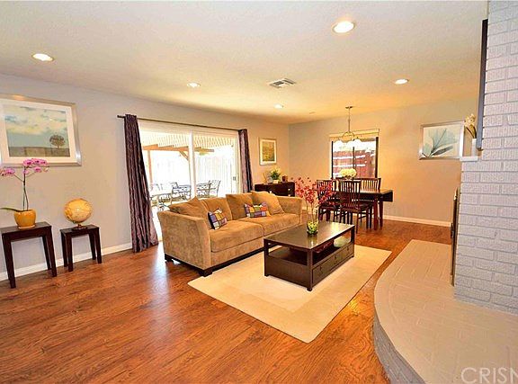 This beautiful single story Saugus home in the Bonelli tract, features an open floor plan with 2 bedrooms (3rd bedroom can be converted back) and 2 bathrooms. This home has nice hardwood and tile floors throughout. The open and spacious living room comes with a fireplace, dual pane windows, and central A/C and heating. The remodeled kitchen that opens to eating area and has newer cabinets and newer corian countertops. The front yard has gorgeous palm trees and a 2 car garage, the large back yard has a swimming pool, and both have a sprinkler systems. Great location near shopping centers, parks, and schools. NO HOA or MELLO-ROOS!