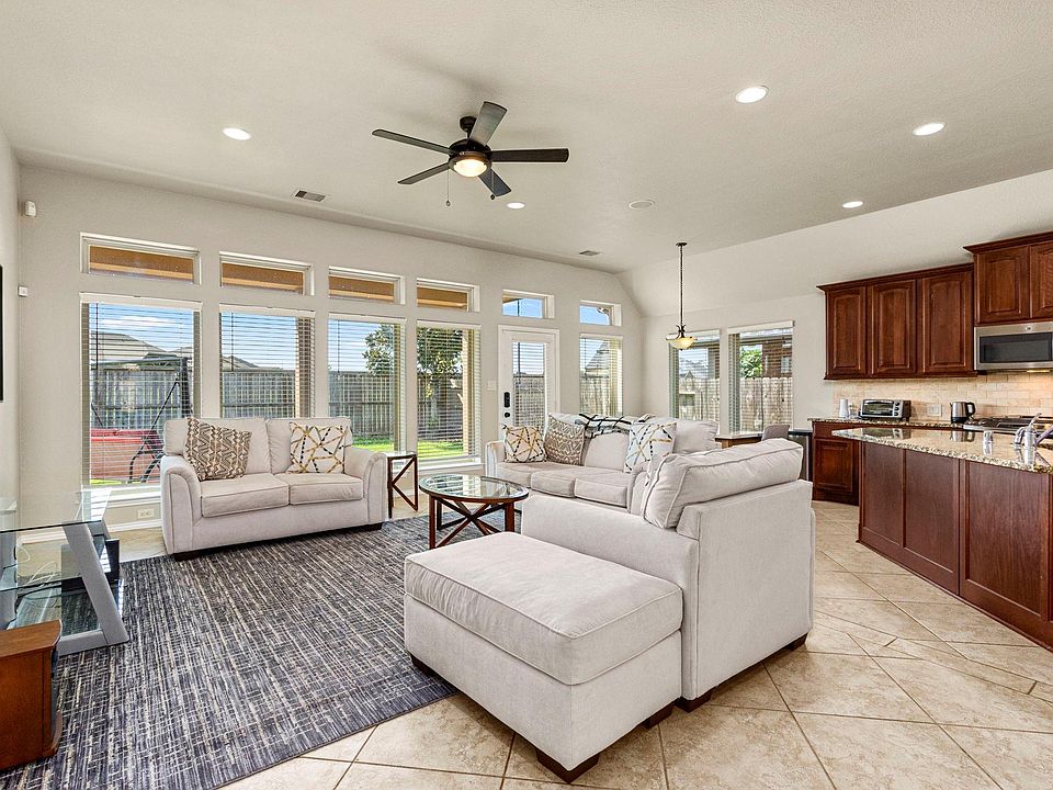 Gorgeous 1 story home in master planned community of River Park West. This popular floorplan by Perry Homes has an art gallery style foyer that opens up to a spacious bright layout, with high ceilings and an abundance of tall windows. Entire home has been recently painted, and all flooring throughout the home is tiled (no carpet anywhere!). Home also backs up to a green belt, so there are no back neighbors! This section of River Park West is zoned to an "Excellent" rated elementary school (buyer to verify zoning) within Lamar Consolidated School district and has easy access to freeway & less than 10 miles from Sugar Land Town Center.