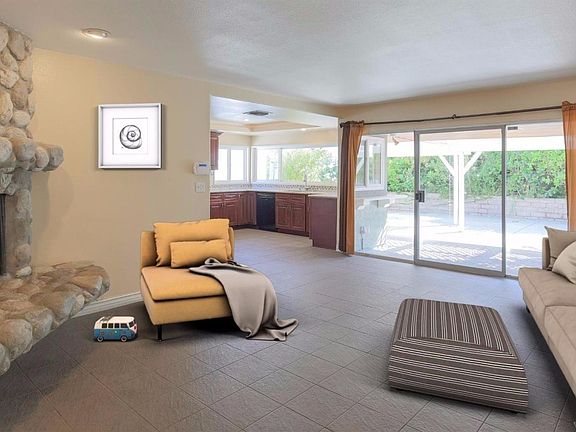 Located on a cul-de-sac street, this Montara single story home offers an open and flowing floor plan! Formerly a 5 bedroom, the Master Bedroom has been expanded making it a 4 bedroom. The front hardscape is accented with brick and rock with a large covered porch opening to a laminate floor entry, a step-down living room with a vaulted ceiling and a brick fireplace. There is a Dining Room and a large Family Room with a corner rock-accented fireplace and open to the granite kitchen displaying updated cabinetry, a trey ceiling with recessed lighting, a glass tile accented backsplash and dual paned windows to a fairytale backyard featuring a lattice-accented covered patio, a grassy yard with a white picket fence and two fun playhouse structures or storage sheds. There is a 2-car oversized garage with a workbench and a side entry door, a hall laundry closet, 3 generously-sized secondary bedrooms and an expanded Master Bedroom with a lighted ceiling fan, laminate flooring, wall-to-wall mirrored closet doors, windows to the back and a Master Bathroom with a double-wide shower and more! This wonderful single story home offers a central location convenient to shopping, great schools, parks, restaurants and more.