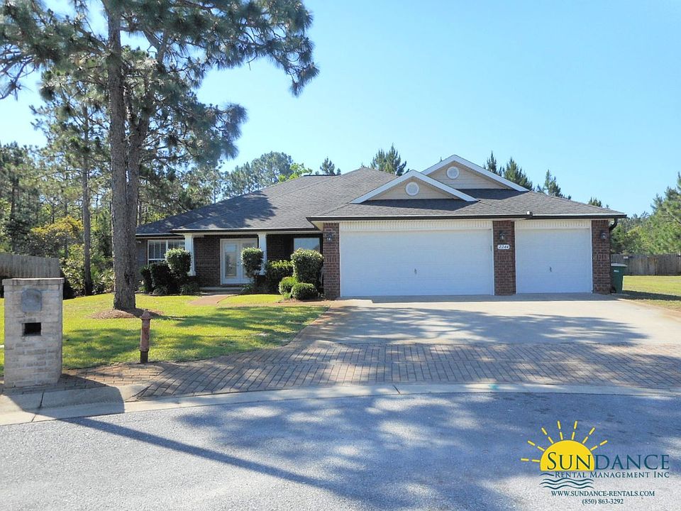Located in Navarre conveniently close to Highway 98, shopping, dining, and just a short drive to Navarre's stunning white sand beaches. This gorgeous 4 bedroom, 3 bathroom brick home offers an attached 3 car garage along with driveway parking on a quiet cul-de-sac. This home is a true must-see! The interior features a freshly painted walls and new laminate flooring in the main area; a formal dining room, an office/study, a spacious living room boasting a cozy gas fireplace and built-in shelving, a large full eat-in kitchen with granite countertops, stainless appliances, ample cabinet space and a breakfast bar, a roomy primary suite with a trayed ceiling, dual vanity, marble counter tops, stall shower, garden tub and walk-in closet, 3 additional good-sized bedrooms, 2 additional full bathrooms one featuring a dual vanity and a large laundry room with utility sink and washer/dryer hooks. Outside you will enjoy an oasis of a backyard with an enclosed patio, multiple open brick patio areas, and a lovely pond. This home also comes with yard maintenance, useful guide for maintaining the home, and using some of its unique features like its surround sound wiring, fabric shield hurricane shutters, and pond waterfall. You do not want to miss the chance to call this magnificent property home! Tenant is responsible for maintaining the pond AS-IS. (cleaning filter on a regular basis and adding pond treatment chemicals to reduce algae) Pets max 2 may be accepted with a $300 per pet non-refundable pet fee (Subject to Owner Approval) No smoking is permitted. In addition to the rental amount, all Sundance Rental Management residents are enrolled in the Resident Benefits Package (RBP) for $25.00/month which includes liability insurance, credit building to help boost the resident's credit score with timely rent payments, and much more! The benefits can be found on our website under Tenant FAQ.