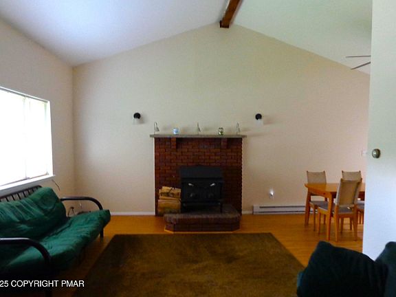 Investment Home Ready to Go. House is rented till Aug. 2026 and offers you income of $1300 per month with a renter that has a great payment record. Home is updated and features three bedrooms and one bath. The living room has a wood stove to keep it toasty. The home has a great back yard and an attached garage as an added feature. The community is close to the Pocono attractions, waterparks, skiing, state parks and outlets. The community has two lakes, community centers and 24/7 security.