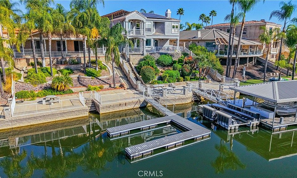 Main Lake Waterfront in the Exclusive Gated Community of Canyon Lake! Welcome to this inviting single story lakefront home featuring an expansive entertainers covered patio overlooking the water plus a large concrete deck, perfect for gatherings, sunbathing, or outdoor dining. Enjoy your newer U-Dock, ready for your boat and lake toys, just step outside and be on the lake in seconds. The home offers a comfortable and open layout with views from the spacious living area. The kitchen has tasteful upgrades like granite counter tops, an electric cooktop, stainless steel refrigerator, and warm maple cabinetry. Enjoy comfortable living with a cozy wood burning fireplace in the family room. Plantation shutters and ceiling fans thru-out the home The double door entry and tile flooring add an elegant touch. The generous sized bedrooms provide plenty of space and flexibility. The front and rear yard landscape is designed with low maintenance landscaping and palm trees, offering great curb appeal with minimal upkeep! Move in ready and full of charm. Live the resort lifestyle with boating, fishing, private beaches, clubhouse, golf, pickleball, equestrian center, and 24 hour guarded gates.