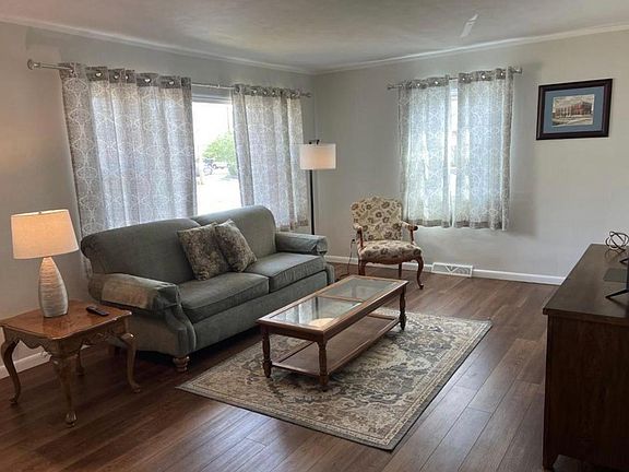 Main floor offers a large eat in kitchen with access to the fenced in private back yard with patio furniture. You'll find two good size bedrooms along with a full bath as well! The large living room with a picture window is great to hang out in.