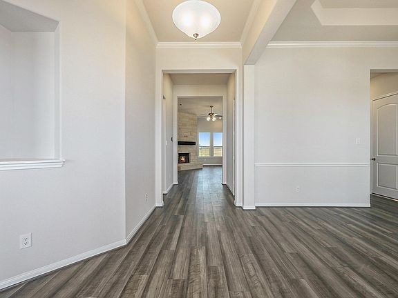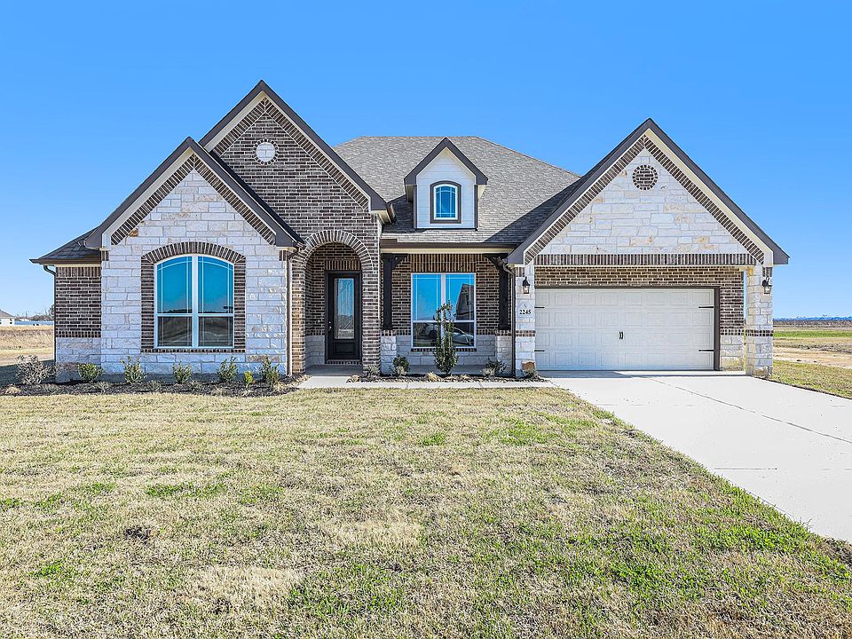 Gorgeous home with front porch, cedar accents, stone and brick! Stunning open floor plan offering over 2600 sq ft has 5 bedrooms or 4 w/study, 3 full baths & 3rd car tandem garage! From the moment you walk in you will be captivated by high ceilings and 8ft doors! The elegant dining room w/chair rail and crown molding is oversized and can fit any size table . The family room has a stunning stone fireplace and is open to the kitchen and breakfast! Oversized utility room with room for folding table and a deep freeze! Large covered patio for backyard entertaining! Private master suite and master bath w/separate tub & big shower w/seat along w/his and her sinks. Bedroom 4 has a mother-in -law suite with a full bathroom right off the hall! Home is equipped with a front yard sprinkler system, structured wiring panel, USB outlet, Media outlets, front gutters, & so much more that is standard! Home is on over an acre lot w/oversized covered patio, 3 car tandem garage! This home is a must see!