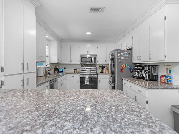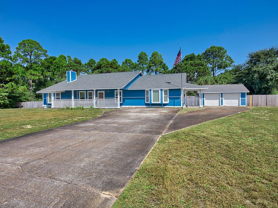 Set on nearly an acre and one of the highest elevation points in Navarre, this beautifully maintained property offers privacy, space, and versatility -- all less than 3 miles from the beach. The double lot backs up to county access, so there are no rear neighbors, and the peaceful backyard makes the most of its natural setting.Inside, you'll find 3 spacious bedrooms, 3 full bathrooms, and multiple living spaces including a renovated office and bar area (2023). A sunken living room with fireplace, a split bonus room with French doors, and a finished garage with A/C give you options for working, entertaining, or relaxing. The kitchen was updated in 2021 with new appliances, lighting, and backsplash, and major systems -- including the roof (2020), HVAC and ductwork (2024), water heater (2024), and electrical panel (2024) have all been taken care of.