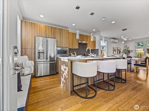 Tucked back from the street, this spacious standalone home in the heart of Ballard features an open floor plan with a large kitchen, dining, powder room, and living area, all on the main floor. Enjoy fall's arrival with a gas fireplace just steps from your fenced private patio and turf wraparound yard. The kitchen boasts quartz countertops, stainless steel appliances, and abundant cabinet space. Upstairs, you'll find tall ceilings in all three bedrooms, including the primary suite with a walk-through closet and a spa-inspired bathroom, along with a bonus space and a laundry room. Highlights include A/C, an expansive rooftop deck with stunning views of the Space Needle and Mount Rainier, off-street parking, and a Walk Score in the 90s.