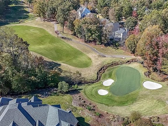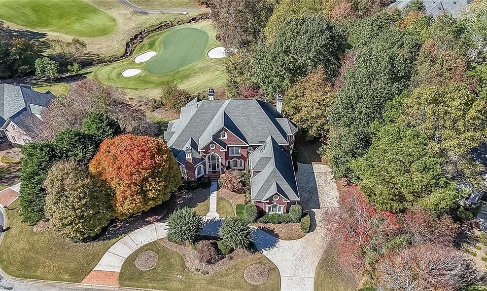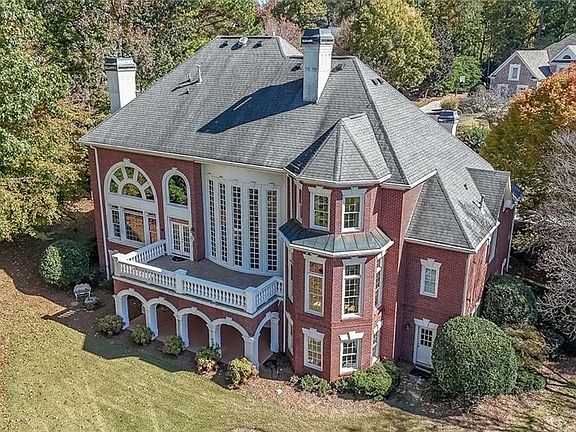 Magnificent four sides brick home with sweeping golf course views in prestigious Sugarloaf Country Club, a guard gated community. This estate home sits on one of the best lots in the community ... it is a premium golf course lot with sweeping views of the 3rd green and fairway, plus it is just under one acre and is set on a cul-de-sac near the gates. The home makes a grand first impression with its circular driveway that also provides plenty of parking. The grandness continues to the interior with a two story foyer graced by a circular staircase, gorgeous chandelier, a dramatic domed ceiling with inset lighting, and beautiful craftsmanship in the trim detail. The banquet-sized dining room and a generously sized fully paneled gentleman’s study (with fireplace and built-in bookcases) flank the foyer. Straight ahead through the foyer is the elegantly appointed two story great room with its fireplace, another stunning chandelier, built-in bookcases, and views to the backyard and golf course. The gourmet kitchen is the heart of the floor plan with adjoining octagonal breakfast room, large walk-in pantry, and vaulted keeping room with fireplace and built-ins. The luxurious master suite is spacious and well-appointed with fireplace and his-n-hers closets. Upstairs is a second full master bedroom with the fifth fireplace, plus three additional large bedrooms with ensuite bathrooms and walk-in closets, and also a charming and unique octagonal office area. The terrace is finished with an entertaining bar, poker room, billiards room with the 6th fireplace, media room, and full bathroom and bathroom, plus there is TONS of room for storage. The home is in a great location in the neighborhood, on a cul-de-sac street near the gates with great golf views.