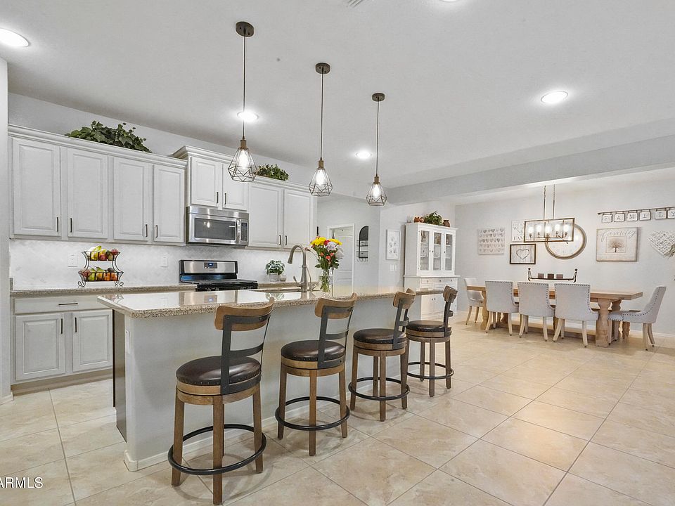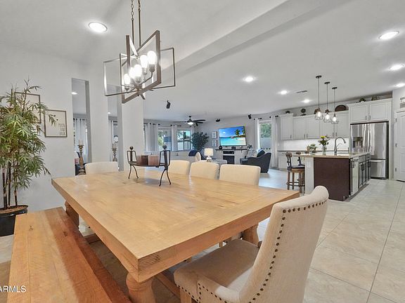 The chef's kitchen overlooks an open great room and features granite counters, under-cabinet lighting, herringbone pattern tile backsplash, R/O system, SS/appliances, 42'' cabinets with crown molding, microwave/convection oven, gas counter-level cooktop, and a walk-in pantry. Adjacent to the great room, a huge primary suite opens to a spa-like bathroom, complete with walk-in shower, double vanities with integrated make-up counter, and incredible walk-in closet carefully designed for the most seasoned buyer. The foyer at the main hall opens to three spacious guest rooms, two of which offer walk-in closets. and a bathroom on one side, with a large utility room, featuring an included washer & dryer. While the extended garage space offers ample storage for your belongings, you'll also find an included soft-water system, electric vehicle (EV) receptacle, and access door to the back yard. Since AZ life revolves around the outdoors, you'll love the expansive covered backyard patio, complete with TV, custom entertainment/storage bar, and extended artistic pavers to entertain all of your seasoned guests. Numerous additional upgrades such as can & under-cabinet lighting, a newer A/C unit, ceiling fans & more have been added to save you $$ & capture your heart!