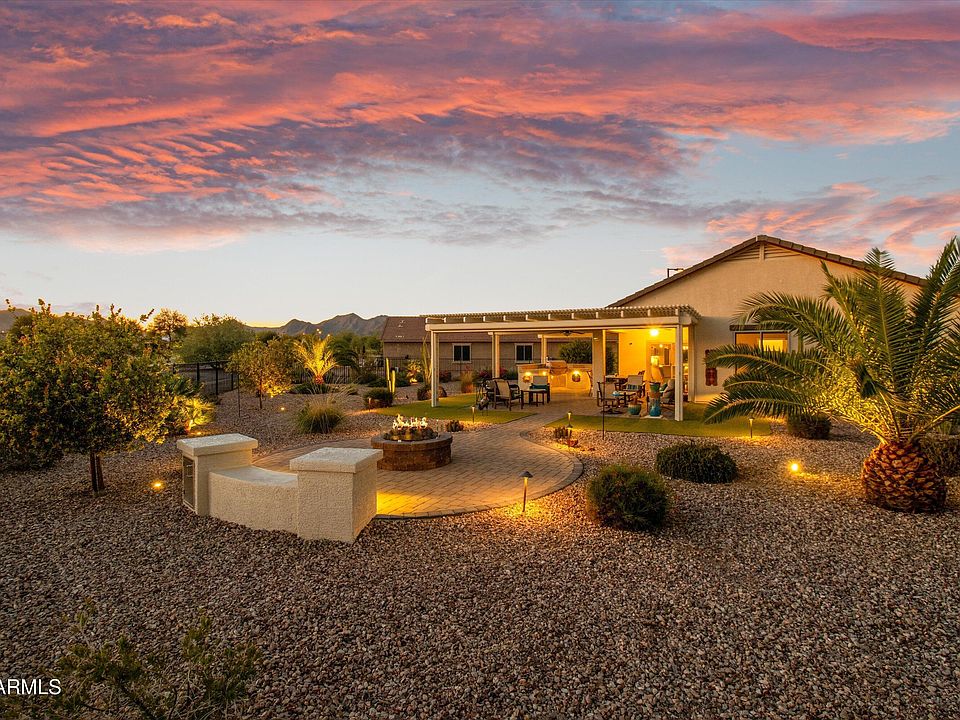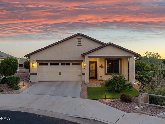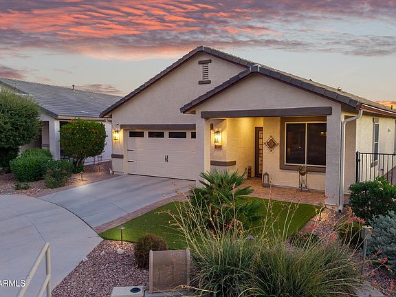 Welcome to the lifestyle you've earned. This one-of-a-kind remodeled Bisbee floor plan home in Sundance Adult golf community is set on a prime oversized golf course lot that backs to the 14th hole. Thoughtfully redesigned with comfort, style, and ease of living in mind. The open kitchen is both beautiful and functional, featuring 42'' cabinets with crown molding, high-end granite counters, and wood-look tile flooring that flows seamlessly throughout the home. The inviting living area offers custom touches like floating shelves, built-in media console, a tiled accent wall, and soft ambient lighting for a warm and welcoming atmosphere. The primary suite has been completely re-imagined with your comfort at the forefront—an elegant spa-like bathroom with a custom tiled shower including safety grab bars, and elevated vanities for ease and sophistication. Step outside to your dream backyard, designed for both relaxation and entertaining. Enjoy evenings by the fire pit, host gatherings at the outdoor kitchen with extended counter space, or unwind under the shaded patio with automatic sunscreens to keep you cool. Professional landscape lighting adds the perfect ambiance year-round. Did we mention those GORGEOUS unobstructed Arizona sunsetsThis is the yard to see them from! Every detail has been considered so you can simply move in and start enjoying the life you've always envisioned. This is more than a homeit's the perfect setting for the next chapter of your story.