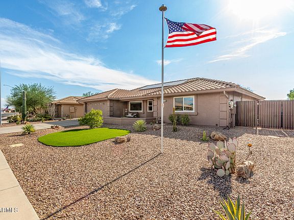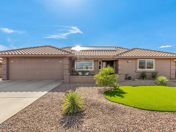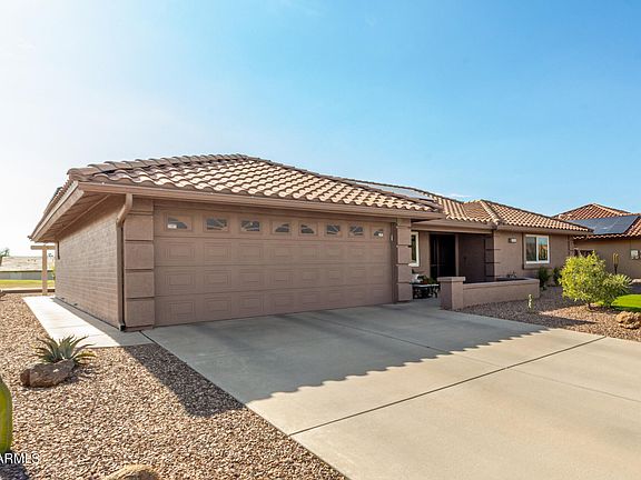 This Gorgeous Golf Course Home - Completely Remodeled from head to toe is ready to impress! Inside, soaring vaulted ceilings, wood-look floors, and a soothing neutral palette set the stage for easy living. The bright kitchen shines with stainless steel appliances, crisp white cabinetry, quartz counters, and a stylish tile backsplash perfect for whipping up favorites or enjoying a bite at the breakfast bar. Retreat to the main suite featuring dual sinks, a walk-in closet, and a private bath made for relaxation. Need extra space? The 3rd bedroom is ideal for an office, hobby room, or quiet reading nook. Out back, unwind under the attached Ramada and enjoy the ease of an energy-efficient home w/owned solar and $0 SRP bills in a vibrant 55+ community. Furniture is negotiable! Completely remodeled in 2022 which includes, new roof, windows, flooring, complete kitchen, both bathrooms, laundry room, exterior and interior paint, water heater, HVAC replaced 3/24. Every ceiling fan & light replaced, basically this is a brand new home. 220v outlet in the garage for EV charging. The solar is owned and there is no maintenance involved and the monthly SRP bills are $0.