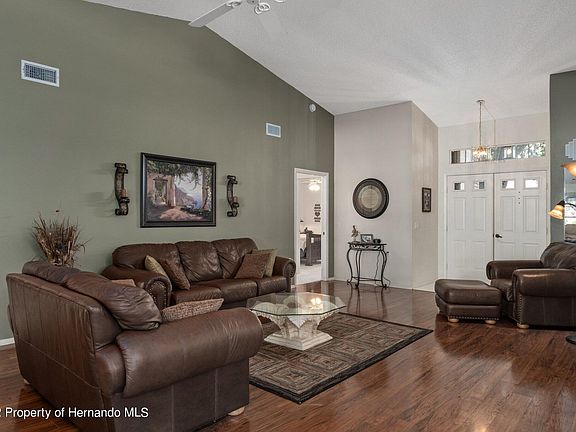 This Immaculate, well maintained, Extended Oakmont model is an end unit located on a corner lot. 2 bedrooms, 2 baths, 2 car garage, features Cathedral ceilings in the great room, laminate flooring, 1840 sq. feet of living space with an additional 210 sq. ft. on the screened patio, which has a beautiful view of the retention area, whole house Hurricane Shutters, stack washer & dryer, laundry tub and upper & lower cabinets in laundry room, Solar Tubes in both baths. The home is being sold furnished, except for personal items. Golf cart being sold separately. New A/C - August 2022, Roof - 2014, stove & dishwasher – 2021, and newer flooring, Monthly Maintenance Fee of $98.00 includes Termite Protection, irrigation, lawn mowing, front hedge (shrubs) trimming, lawn fertilization, pest lawn & weed control, exterior painting, NO DOG VILLAGE. Timber Pines is an award winning, 55+ Active Adult Community, Gated Community with 4 golf courses, 2 pools & hot tubs, Country Club with a newly remodeled restaurant and lounge, Performing Arts Center, 2 Pro Shops, 12 new state-of-the-art Pickle Ball Courts, Tennis, Fitness Center, 2 new Dog Parks and a new Wellness Center opening soon, over 100 clubs and activities to enjoy in this beautifully maintained community. The HOA Fee $291 includes basic cable, 2 boxes and high-speed internet. A one-time Buyer's Capital Contribution of $2,190 to be paid at closing. Recliner in the Master bedroom does NOT CONVEY. THE CANADIAN SELLERS WILL ONLY ENTERTAIN OFFERS FROM BUYERS WHO ARE WILLING TO SIGN THE FIRPTA WAIVER.