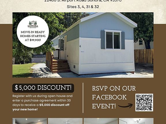 New Home in Beautiful Sonora, CA! Spacious, Stylish, and Affordable - Welcome to Sonora Estates Site #31 Modern comfort meets small-town charm in this gorgeous new manufactured home nestled in the heart of Sonora, just minutes from downtown, Jamestown, and the historic streets of Columbia State Park! Home Features: 3 cozy bedrooms & 2 sleek, modern bathrooms Bright open-concept layout with a spacious kitchen island-perfect for entertaining All-new stainless-steel appliances including a dishwasher Elegant hardwood cabinets and washer/dryer hookups Solid 2x6 construction, WUI certified (fire-resistant), and Energy Star certified for energy efficiency Backed by a 7-year warranty for added peace of mind Enjoy comfort, convenience, and the serene beauty of Gold Country-all at a price that makes sense. Whether you're growing your family, downsizing, or just looking for a peaceful place to call home, this is your opportunity to own a beautiful, move-in-ready home in one of Sonora's most sought-after communities. Schedule your private tour today! #Sonora #SonoraCA #NewHome #ManufacturedHome #ForSale #RealEstate #DreamHome #CaliforniaLiving #SonoraEstates #ThreeBedroom #OpenKitchen #HomeSweetHome