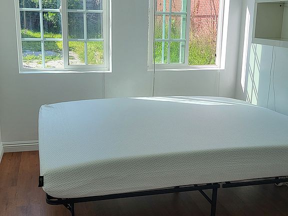 The second room is the bedroom with a new queen size bed frame and matrress.