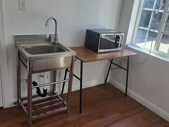 The first room is a living area with a newly intalled utility sink (hot/cold water fauset). There is microwave, mini refrigerator, a desk for study. no stove.