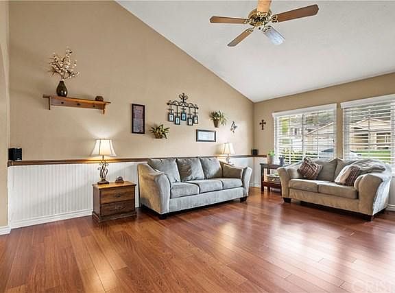 Simply wonderful single story home with RV parking! Stunning looking rich wood like flooring flows thru the main living areas! Vaulted ceiling in formal living room which boasts beadboard wainscoting, raised baseboards and a ceiling fan. Dining area is open to the family room with raised baseboards & crown molding. Cozy fireplace in the family room with slider to the yard and recessed lighting. The kitchen is also open to the dining area and family room with white cabinetry, breakfast bar and recessed lighting. Master features a vaulted ceiling, a slider to the yard, ceiling fan and recessed lighting. Private master bath with large step in shower, a vanity with lots of counter space & tile flooring. 3 more bedrooms each with ceiling fans and recessed lighting. Guest bath has shower/tub combo and wood like flooring. Enjoy the outdoors with a large patio and solid covered patio, plenty of grassy area and a big covered wooden gazebo perched on the hill for surrounding vistas.