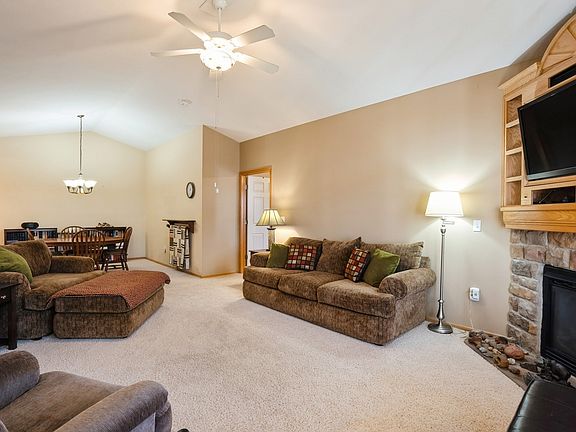 This is the zero entry townhome you have been waiting for! Fantastic open floor plan, 2 bedroom/2 bath unit with 2 car attached garage. Vaulted dining room & living room with gas fireplace make this plan feel open and spacious. Large kitchen with plenty of storage plus pantry and all appliances included. Laundry room w/ washer & dryer. Primary suite features its own bath with double vanity, jetted tub, large walk-in shower and spacious closet. The second bedroom has large corner windows to let in natural light. Plus a full bath. Extra storage space in the oversized 2 car attached garage. Front porch and patio area is perfect for enjoying your outdoor space. This unit is an ideal location giving you a sense of privacy as you look out to a tree-lined green space close to walking/bike path. Located close to grocery store, shopping, restaurants, and entertainment district of Prairie Trail. Pets permitted up to 25 lbs.