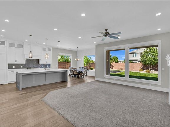 Custom home located in the highly sought after Fieldstone neighborhood within Little Valley. Thoughtfully designed with quality finishes throughout. This home offers a spacious open concept living area with custom built in shelving, cozy fireplace and large windows that flood the space with natural light. The kitchen is a showstopper, featuring quartz countertops, gas cooktop, double wall ovens, a hidden walk in pantry and custom cabinetry extending to the ceiling. A functional mud room and well appointed laundry room provide additional storage. Upstairs includes a second family room, three additional bedrooms, and two baths. The expansive backyard is perfect for entertaining, complete with an in ground trampoline, putting green, storage shed and large cement pad for RV Parking. Plenty of room to add a pool.