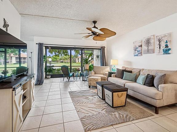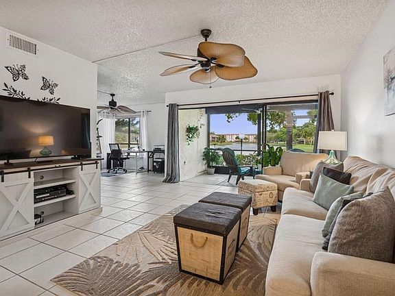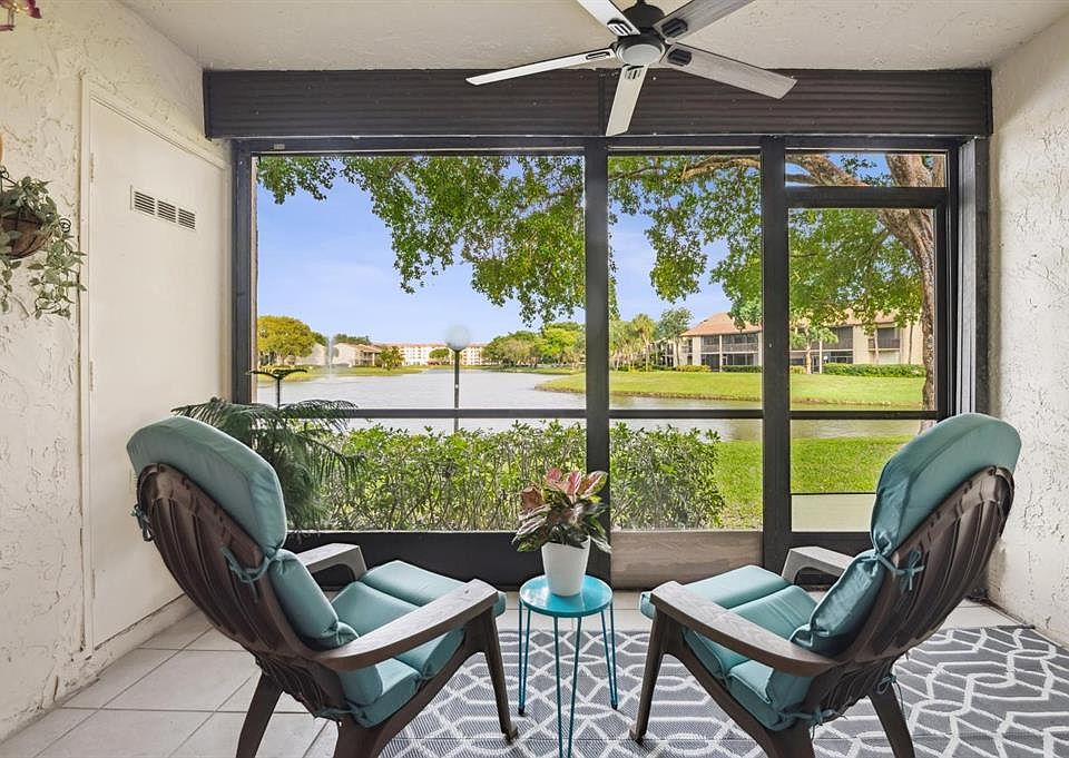 Freshly painted in modern neutral tones, the home features a bright white kitchen, updated bathrooms with newer vanities, and tile flooring throughout for easy living. Enjoy the serene outdoors from your screened-in patio with roll-down shutters, perfectly positioned to capture tranquil lake, fountain, and garden views.