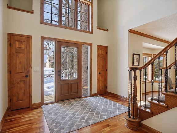 Exceptional two-story situated on a large wooded lot located within Eastview HS boundaries. Beautifully updated kitchen features stainless appliances, abundant knotty alder cabinets, gas cooktop, double wall ovens, cherry flooring, & stunning bowed informal dining area. Gorgeous hearth room with stacked stone gas FP & built-in shelving in addition to main floor family room with gas fireplace, built-in bar with storage cabinets & beverage refrigerator. Spacious private office tucked behind laundry/mud room, wonderful 4-season porch & two-tier deck to enjoy the private back yard. Four BR’s on upper level including owners’ suite with sitting room, two closets, & private bath. Walkout lower level equipped with family room & gas FP, amusement room, plumbed bar area, & tiled ¾ bath plus new carpet & fresh paint.