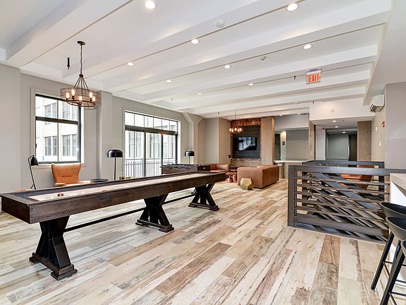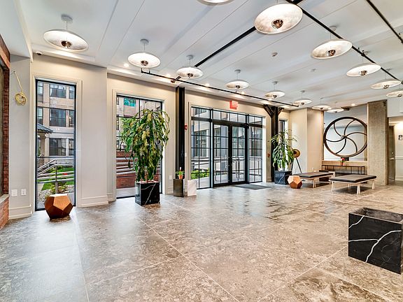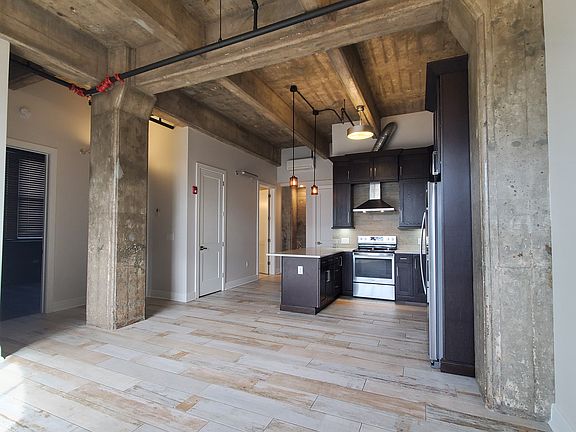 Modern light fixturesKitchen with breakfast barHigh ceilingsLoft style windowsCloset spaceExposed beams and brickOutside balcony