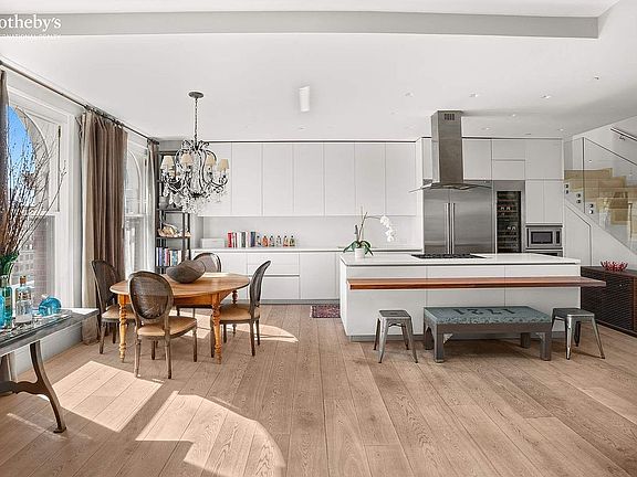 The great room captivates with soaring ceilings and a wall of windows framing Madison Square Park, offering unobstructed vistas of the Flatiron Building. A newly renovated open kitchen is outfitted with a brand-new Sub-Zero refrigerator and freezer, a Sub-Zero 98-bottle wine refrigerator, Wolf oven range, Bosch convection oven, and microwave — designed for both effortless entertaining and everyday living. A cleverly designed closet under the stairs conceals a second wine fridge and provides ample storage for larger household appliances.