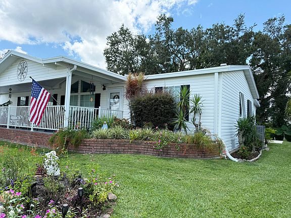 WOW, this home is incredible! From the moment you arrive, the exceptional curb appeal of this residence makes an unforgettable first impression. Lush, manicured landscaping frames the charming front porch, the perfect spot to sip your morning coffee while enjoying the gentle Florida breezes. Ideally positioned on a peaceful side street, this property offers the rare advantage of backing up to the community's scenic "creek," complete with vibrant foliage and a picturesque wooden bridge, creating a tranquil, storybook setting. Step inside, and you'll feel as though you've entered a brand-new modern home. This triple-wide floor plan delivers abundant living space, complemented by tasteful updates and meticulous care. The spacious lanai is a true highlight, fully enclosed with acrylic windows, insulated, and equipped with a stand-alone A/C unit, making it a comfortable extension of your living area year-round. Beyond the lanai, a charming rear patio invites you to relax and soak in the private tropical view. The highly sought-after double-wide carport provides generous covered parking, and a 2022 golf cart with new batteries is included for easy community cruising. Inside, huge windows flood the home with natural light, creating an airy and inviting ambiance throughout. The chef's kitchen features beautiful recycled glass countertops, a double oven, and an abundance of storage, including a spacious pantry. Whether preparing an intimate meal or entertaining guests, this kitchen blends functionality and style seamlessly. The primary suite offers the perfect retreat, with his-and-hers closets-including a spacious walk-in for her and a fully updated en suite bathroom with modern countertops, a sleek walk-in shower, stylish new fixtures, a new toilet, and gorgeous porcelain tile flooring. The split floor plan provides two additional bedrooms, one featuring a Murphy bed for space-saving versatility ideal for guests, hobbies, or a home office. The home comes complete with a washer and dryer, and a few select pieces of furniture are negotiable. Practical updates offer peace of mind, including a newer A/C unit, roof, and most appliances. The water heater is conveniently located in the exterior shed, keeping interior space maximized and simplifying maintenance. Every detail reflects quality and care, making this home feel like a model. Offering a rare combination of style, comfort, and location, this is not just a home-it's a lifestyle you'll fall in love with from the moment you step inside. The Gardens is a premier 55+ manufactured home community on Florida's Gulf Coast, featuring a 13,000 sq ft clubhouse and a wide range of amenities, including a billiard room, ballroom, craft room, library, media room, and a state-of-the-art fitness center. Enjoy outdoor recreation with an Olympic-sized pool, jacuzzi, tennis courts, shuffleboard, and horseshoe pits. With so much to do, boredom is simply not an option here! Lot rent is based on the home's location and covers a wide range of services, including community amenities, 200-channel cable, two HD boxes, high-speed internet, and lawn care. While all information is considered reliable, we always recommend a home inspection by an independent company to ensure accuracy, as we cannot guarantee the condition of the home. Lot rent is determined by the community office. Don't miss out on this fantastic opportunity in an incredible community call today!
