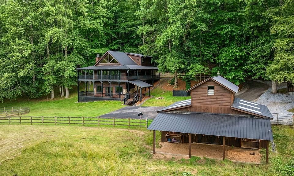 Discover the tranquility and privacy on this breathtaking property situated on 19.22 acres on the Cohutta Ranch. As you enter the home you will find a welcoming open floor plan that seamlessly connect the living room, dining space & kitchen. This completely updated Cabin with just under 3000 sf of living includes 3 spacious bedrooms, each featuring its own private bathroom for ultimate comfort and privacy. Luxury modern style master bath on main offers tiled shower with bath enclosed, double vessel styled vanities and granite counters. Large walk in closets in all bedrooms. The beautiful features include vaulted ceilings, gorgeous floor to ceiling stone fireplace and beautiful wood flooring. Enjoy cooking for your guest in your amazing kitchen offering granite countertops and stainless appliances. The living room offers full wall of opening doors flooding the home with natural light & gorgeous views of your property. The living areas create a cozy and inviting ambiance, perfect for relaxation and gatherings. The fully finished basement is a great entertaining area with laundry room and office area or your own private library. Wrap around porches on every level allow you to take in the days of mountain air offering mountain views of the picturesque pond or the meandering creek frontage or watching the stars by your firepit. This property also has 2 spring heads. This peaceful equestrian property features 5 lush fenced paddocks and fabulous 3 stall center aisle barn with office and detached 2 car garage. Community offers additional barn for boarding, fire pit, pavilion for cookouts & walking trails. It also borders the US forestry. Do not miss the chance to make an amazing farm property your own. Contact me today for more details or to schedule your private showing.