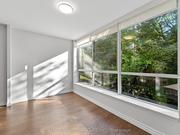 Welcome to 225 Davenport, a boutique residence where this spacious 1+den plus sunroom offers rare comfort and charm right at the edge of Yorkville. Bathed in morning light from its east-facing windows, the suite enjoys peaceful garden and treetop views, far removed from the hum of Avenue Road and Davenport. Inside, smooth ceilings (no popcorn), an upgraded kitchen with a brand-new electric stove, and fresh window coverings create a move-in-ready home that feels both refined and inviting. The generous living space makes it easy to entertain or simply unwind, complemented by a spacious bedroom that fits a full furniture set and features a walk-in closet and is finished with timeless wood shutters that add a touch of charm and character. A separate den off the entry provides flexible space for a home office, while the sunroom expands the living area with a serene garden outlook. The large bathroom with a Jacuzzi-style tub and a small laundry room with ample storage add everyday convenience. The building itself is known for its friendly staff, amenities include a phenomenal rooftop terrace with skyline views and BBQs, a well-equipped gym and stylish party room. Just steps to Yorkville's world-class shops, dining, and cultural scene, this home stands out as a rare opportunity, offering unbeatable square footage at almost 900 sqf, quality, and value in a neighbourhood where space comes at a premium. - All utilities included in the maintenance fees.