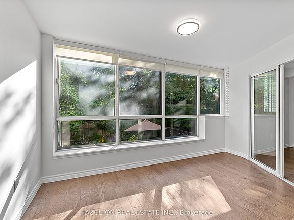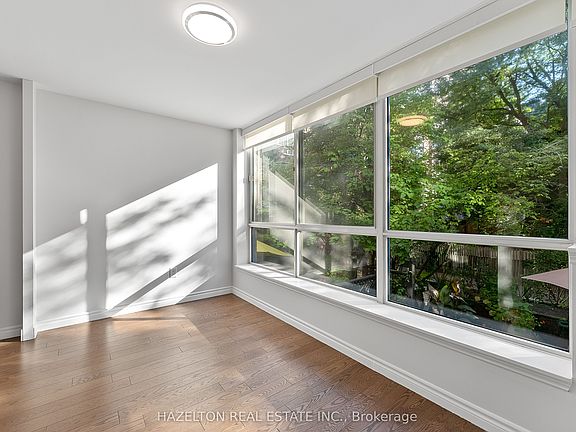 Welcome to 225 Davenport, a boutique residence where this spacious 1+ den plus sunroom offers rare comfort and charm right at the edge of Yorkville. Bathed in morning light from its east-facing windows, the suite enjoys peaceful garden and treetop views, far removed from the hum of Avenue Road and Davenport. Inside, smooth ceilings (no popcorn), an upgraded kitchen with a brand new electric stove, and fresh window coverings create a move-in-ready home that feels both refined and inviting. The generous living space makes it easy to entertain or simply unwind, complemented by a spacious bedroom that fits a full furniture set and features a walk-in closet and is finished with timeless wood shutters that add a touch of charm and character. A separate den off the entry provides flexible space for a home office, while the sunroom expands the living area with a serene garden outlook. The large bathroom with a Jacuzzi-style tub and a small laundry room with ample storage add everyday convenience. The building itself is known for its friendly staff, amenities include a phenomenal rooftop terrace with skyline views and BBQs, a well-equipped gym and stylish party room. Just steps to Yorkville's world-class shops, dining, and cultural scene, this home stands out as a rare opportunity, offering unbeatable square footage at almost 900 sqf, quality and value in a neighbourhood where space comes at a premium. All utilities included in the maintenance fees.