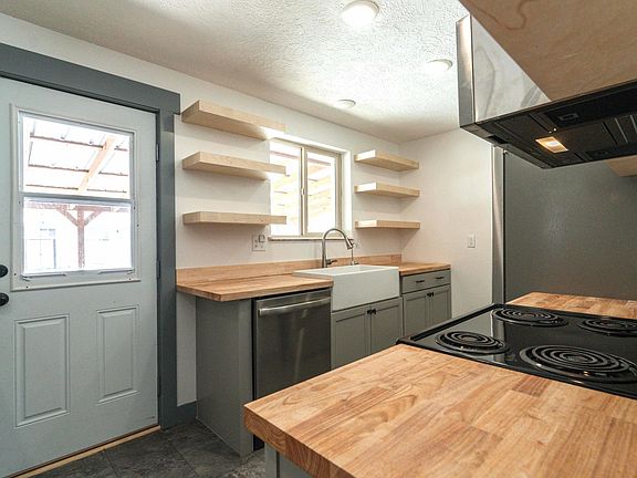 Includes washer, dryer, stove, fridge, dishwasher, built-in microwave, and custom shelving.