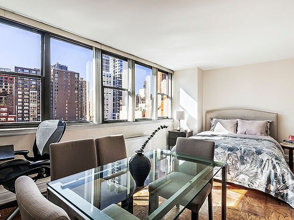 **Back on the market! Alcove Studio/Junior 1 Bedroom with 11th Floor Panoramic Views!** Facing South, this alcove studio is flooded with all day sunlight from its wall of 5 windows and features open views of Midtown, St. Vartan's Park, and a partial East River view. The updated kitchen features a full size Blomberg stainless steel refrigerator and a combination microwave/convection oven. Updated bathroom with newer tile and freshly replastered and painted walls. 4 closets, one a walk-in, provide ample storage. Maintenance includes heat, hot water, gas and air conditioning (a rarity!) Board permits pied a terres, parents buying with working children, gifting, and subletting after 3 years. Maintenance has remain unchanged for 10 years. Pets allowed! Note board does allow ARMs, but at 75% financing and additional qualifications are required, ask listing agent. 80% financing allowed for fixed rate loans. You can call, text, or email me directly via the contact details on the floorplan.