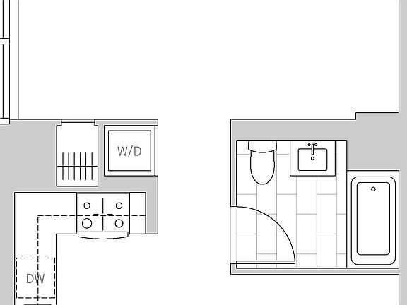 Oversized studio with corner floor to ceiling windows, separate sleeping area, and large u-shaped chef style kitchen with Caesarstone countertops and stainless steel appliances. Apartment also features an in-unit Bosch washer/dryer, and contemporary bath with rain shower head.