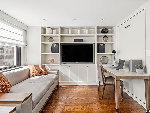 Upon entering 14D, you will be greeted by a foyer opening to a 21-foot wide living room bathed in daylight through four south-facing windows. Adjoining the living room are bifold sliding doors which discreetly conceal a convertible guest room. Transform this space into a home office with a window-side desk and custom-built bookshelves.