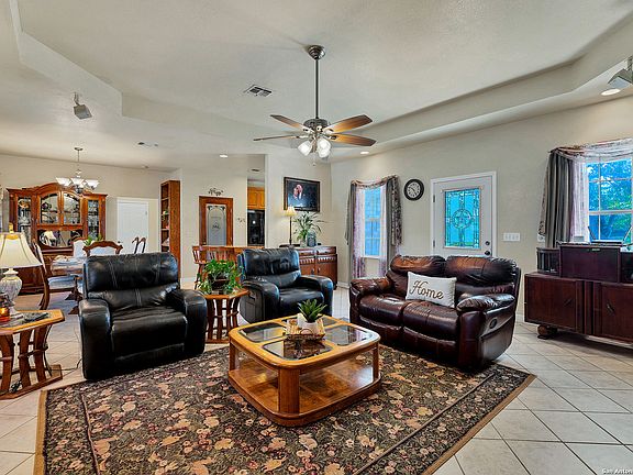 Come experience country life! This beautiful, horse friendly property is perfect for anyone who loves the outdoors, but it is still close enough to the city amenities of Pleasanton and San Antonio. This property has over 2 acres of land with mature trees that provide a serene and picturesque setting, and the large pool and BBQ area are perfect for entertaining guests. The pergola just off of the main house and casita offers a quiet place to watch the sunrise or sunset, and possibly catch a glimpse of abundant wildlife. The paved circular driveway not only adds convenience but also enhances the property's curb appeal. With ample parking spaces, hosting gatherings and accommodating guests will be a breeze. Additionally, the covered outdoor shed and poultry coop offer endless possibilities for storage, hobbies, gardening, or even starting your own small farm. This property truly has it all, combining natural beauty with practical features. The 1,603 sqft main house offers 2 bedrooms, 2 bathrooms, an open living and dining space, with a large utility room. While the detached 603 sqft casita has 1 bedroom, 1 bathroom, walk-in closet, with a large living area, and a private front porch. This is sure to be the perfect place for you to relax and get away from it all. Schedule a tour today to find out more about this fabulous property!