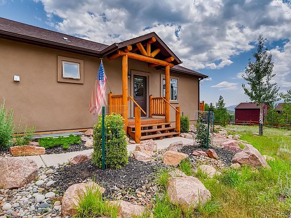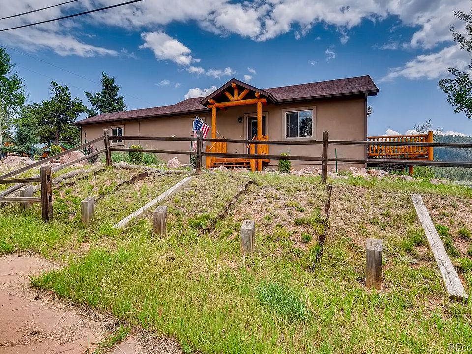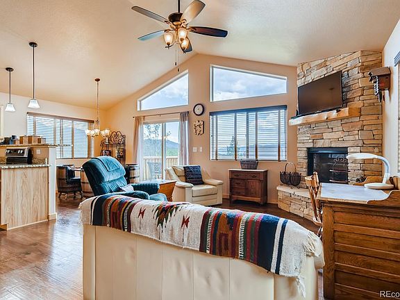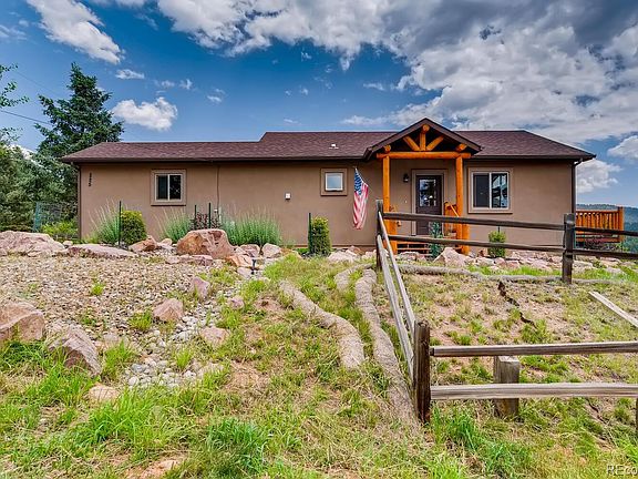 This home has some of the most spectacular views of Pikes Peak in the area! Charming Woodland Park ranch plan features 3 bedrooms (1 main / 2 conforming bsmt), 2 baths (1 main / 1 bsmt), living room with gas fireplace, kitchen w/breakfast bar and breakfast nook, finished basement and side load garage. Enjoy the stunning views from the rear deck or from several indoor vantage points. Beautiful upgrades and finishes including hardwood floors, slab granite counters in the kitchen, stainless steel appliances, open floorplan, gorgeous natural wood doors & cabinets and gutters have French drains. Located on a spacious .24 acre lot with landscaping, natural vegetation and trees. The finished walk-out basement is perfect for guests or that teen wanting their own space. The energy efficient furnace, ceiling fan and gas fireplace keep this home comfortable all year long. Pride of ownership shines throughout. This home offers a peaceful oasis while still being close to dining, shopping, entertainment and other amenities. No HOA. Dont miss your opportunity. Welcome Home!