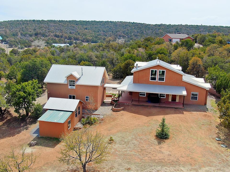 EXCEPTIONAL one owner custom home perfectly nestled among pinons & junipers on 4.89 wooded acres, entirely fenced & gated in Edgewood, NM! Serenity & peaceful surroundings abounds with a wildlife corridor! Take in the views & out door living from 3 porches surrounding the home. Delightful kitchen with an abundance of custom cabinetry, granite counter tops, cook top, Bosch dishwasher & dining area with wall of windows! Generous living room w/wood burning stove! Main floor master suite & sitting room! Barn doors open to the deluxe bathroom with garden tub, shower & walk-in closet! Main floor bedroom & full bathroom! Upstairs: Large loft, 2 bedrooms & full bathroom! Heated 590 sq ft office/guest room & 3/4 bathroom located in the 2 car garage! An AMAZING 902 sq. ft. garage...and MORE...!