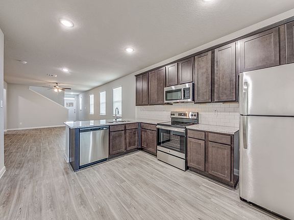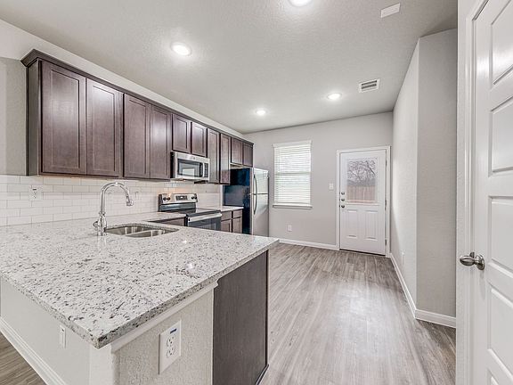 Lovely 2-story duplex home in a great neighborhood. Features an open concept floor plan with stainless steel appliances and wonderful countertops with eat-in bar. The primary bedroom is downstairs and features an attractive bathroom complete with walk-in shower, separate vanities, and large walk-in closet. The 2 sizable bedrooms upstairs do not share walls with each other or any living areas. Ceiling fans in all bedrooms. Office nook at the top of the stairs. Walk-in attic access with decked storage space and full size door. The covered patio is located off the kitchen. Great backyard with privacy fence. Automatic lawn sprinkler system. 2-car garage with opener. Built in 2023. Located minutes from the quaint eclectic downtown of Cibolo. Schertz-Cibolo-Universal City ISD. Easy commute to JBSA Randolph AFB, San Antonio and New Braunfels.