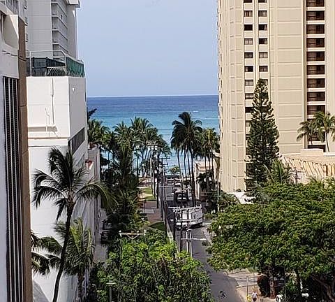 9th floor unit, if you walk down the hall you can check the ocean surf 1 short block away. The Waikiki Imperial at 225 Liliuokalani Ave is a clean, solid 10 story building with no pool, gym or fancy lobby but it has excellent security and only 4 units per floor. Very comfortable, like a house. 2 guest parking spots for visitors, deliveries or dropping off groceries.