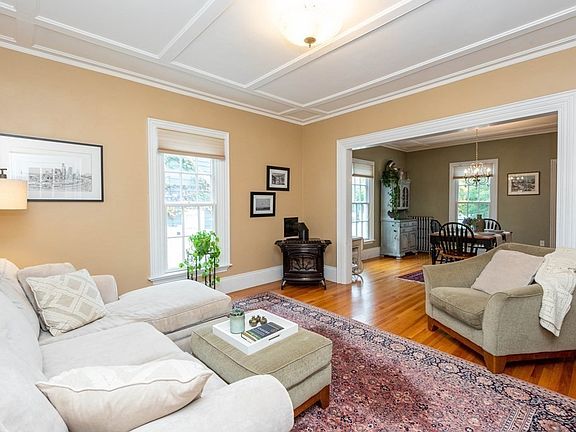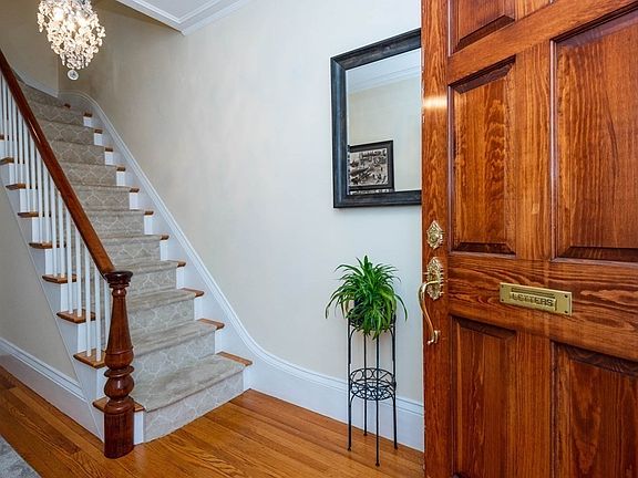 Your search is over once you step into this lovely updated 4 bedroom, 1.5 bath home! Charming farmer porch opens to spacious entryway with stained glass windows both beside the front door and at the landing to the second. Spacious living room with gas stove opens to the entertainment sized DR. Updated kitchen with cherry cabinets, granite counter tops, double sink, stainless appliances and a breakfast nook. First floor is well suited for the at home professional with an additional first floor den/office and convenient half bath. Two staircases to the second floor, one leading from the kitchen, and the other by the front entry add to this homes charm. Second floor has 3 ample sized bedrooms and a smaller one currently being used as an office and a full bath. Two additional finished unheated rooms in the third floor. The attached garage can fit 2+ cars and leads into the basement. This home has the convenience of being near schools, downtown, shopping, transportation and commuter rail.