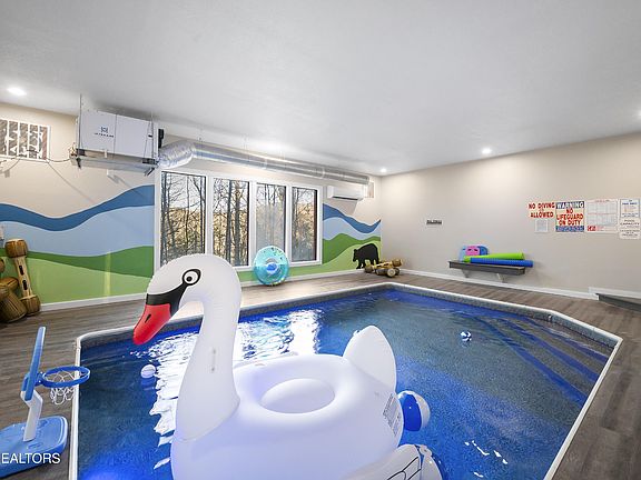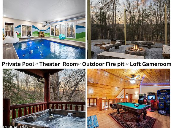 Welcome to your Smoky Mountain retreat in scenic Cosby, Tennessee—just minutes from the Great Smoky Mountains National Park! This impressive 4,400+ sq. ft. cabin has a proven rental history and comfortably sleeps up to 23 guests. With 5 bedrooms—including 5 primary oversized en-suite (all king beds) plus a bunkroom with its own bath—and a convenient half bath off the dining room, this property is designed for large gatherings and strong rental performance. Entertainment and relaxation are endless! The private heated indoor pool, recently remodeled with a new liner, new deck, and updated climate-controlled system (featuring a dehumidifier and mini-split unit), is maintained at 82° year-round. Guests will also love the brand-new hot tub, the updated theater room, and the loft arcade complete with pool table and games. Outdoors, the cabin offers a custom wood-burning fire pit perfect for evenings under the stars, two park-style charcoal grills, a wide front porch, and a spacious covered rear deck with plenty of room to gather. Each bedroom features a Smart TV and private bath for comfort and convenience. Set on a 1.07-acre lot with a level circular driveway and ample parking, this turnkey property has been freshly updated with new flooring, paint throughout, and a custom pool mural. Located just a short drive from Dollywood, Gatlinburg, and all the area's top attractions, this Smoky Mountain lodge is the perfect blend of investment opportunity and family getaway.