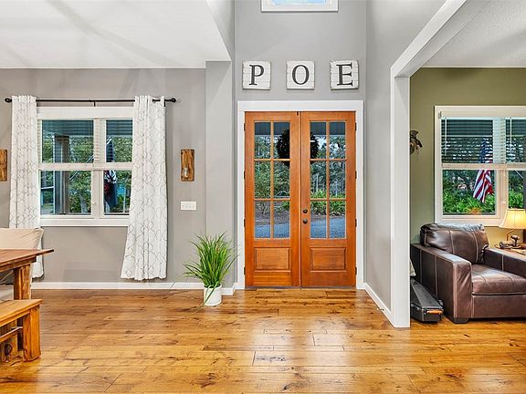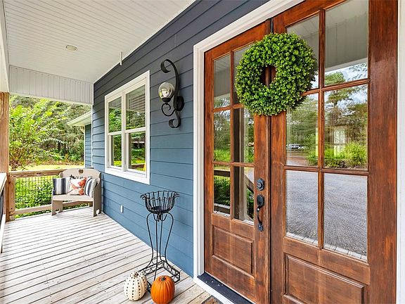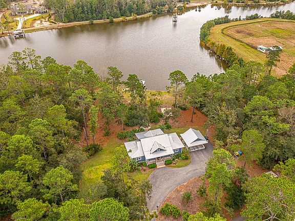 Southern Charm Meets Lakeside Living. Nestled on 3.38 acres of picturesque countryside, this four-bedroom, two-bath home offers sweeping views of the tranquil waters of Lake Maryanne. A true retreat for those seeking the charm of Southern living, this property delivers privacy, comfort, and style in spades. Step inside to discover a spacious open-concept living area that seamlessly blends the dining room, kitchen, and living room into the perfect gathering space. The kitchen is a showstopper, featuring stainless steel appliances, white shaker cabinets, granite countertops, and a striking blue herringbone backsplash. With no carpet throughout and a split floor plan, this home is designed for easy, everyday living. The primary suite is a luxurious haven, boasting a spa-like bathroom with dual vanities, a walk-in tiled shower, and a generous closet. The additional bedrooms are equally inviting, sharing a well-appointed full bath with a tiled tub-shower combination. A spacious mudroom offers the ideal space to kick off your shoes after a day spent enjoying the lake. Step out onto the back porch to soak in the stunning lake views, or take a short stroll to the fire pit for cozy evenings under the stars. For the hobbyist, the 24x24 workshop is a dream come true, while the covered parking adds convenience. But the backyard steals the show—a covered dock invites you to fish, relax, or simply savor the serenity of lakeside living. This property is the perfect escape to call home. Come and experience your very own country retreat!
