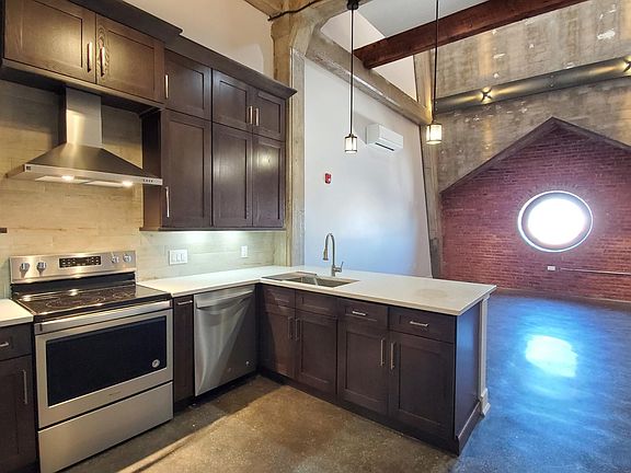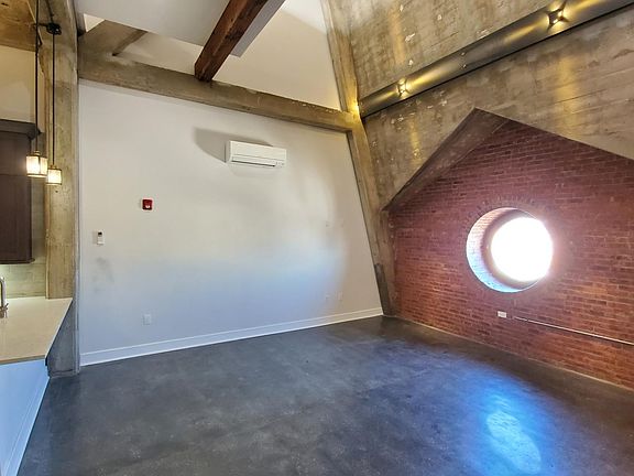 Modern light fixturesKitchen with breakfast barHigh ceilingsLoft style windowsTwo floorsCloset spaceExposed beams and brick