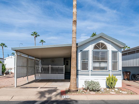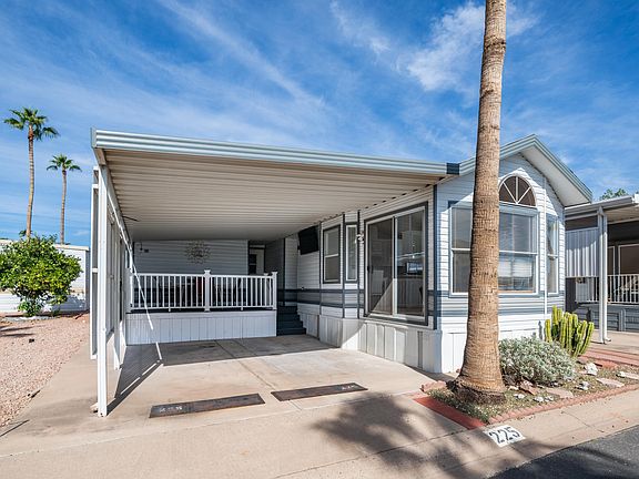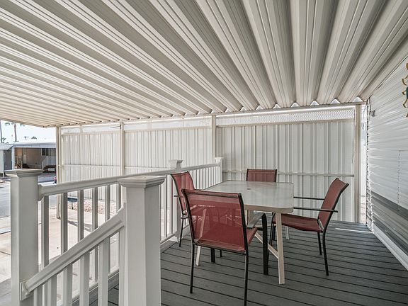 Location really doesn't get much better than this south facing gem just steps from the resort clubhouse. This sunny getaway has everything you need to settle right in & start enjoying the good life in Arizona. Peace of mind comes easy with a brand new roof scheduled for December 4th & a newer AC/heat unit keeping things comfortable from day one. The oversized covered parking keeps your car cool & happy, plus the extra side parking is a rare find that's perfect for your golf cart with room to spare. Inside you'll find lots of natural light, an open & functional floor plan with a U shaped kitchen, freshly painted cabinets, a newer refrigerator, laminate flooring throughout with no linoleum anywhere, & plenty of space for cooking & chatting at the same time. The private paved backyard patio is ideal for barbecues, happy hours, or catching up with friends who just happened to stop by. Step onto the newly added Trex deck that steals the show with only four steps up & once you're there all of your living is on one level with tons of storage underneath the deck in the front back & side. Youll love the roomy bedroom with a large mirrored closet, a queen gel memory foam mattress that practically begs you to sleep in, a large built in dresser with plenty of drawers, & even more storage under the bed. The guest room is ready for visitors or hobbies & has additional under bed storage as well. There's a designated washer & dryer setup to make laundry a little less of a chore. The newer AC keeps everything cool while you relax in this easy to love move in ready home complete with four TVs & a comfy new sleeper sofa. With plenty of space, sunshine, storage & personality this one is ready for you to start living the lifestyle everyone talks about because owning here really is where the fun begins.