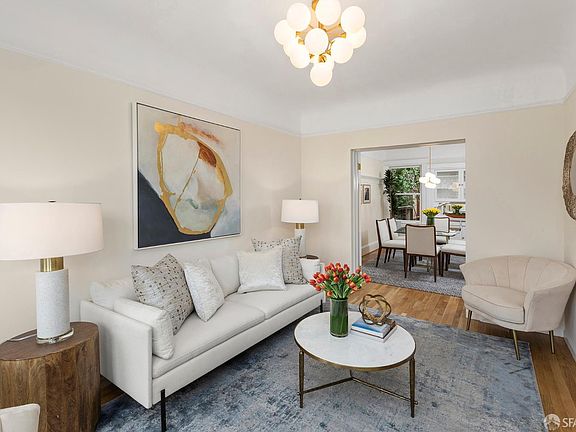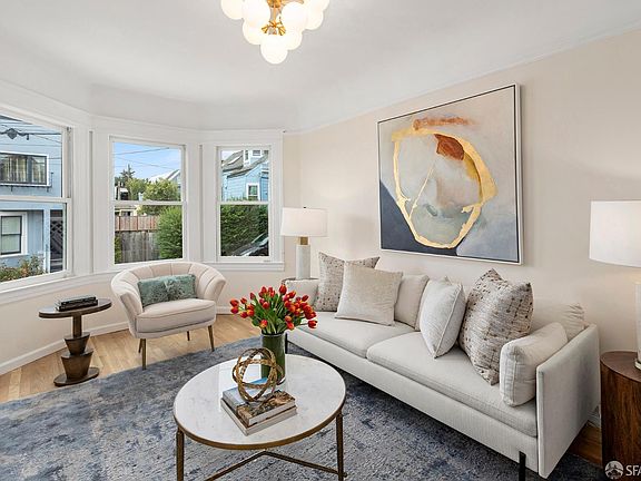 On a prized block in the heart of Bernal Heights, this beautiful Edwardian home is flooded with light from its expansive windows and skylights. The home has been thoughtfully updated for modern living while retaining its charming period details. The newly-remodeled chef's kitchen is handsomely appointed with stainless steel appliances, quartz counters and ample cabinetry. Offering the ultimate in indoor/outdoor living, the kitchen opens onto an expansive walk-out deck for dining under Bernal's sunny skies. The spacious formal dining room is ideal for entertaining. On the upper level, there are two expansive bedrooms boasting hardwood floors and generous closets. These bedrooms are served by a bright, skylit bath with a deep jetted tub. The primary bedroom offers lovely views of the bay and the tranquil garden. An additional bedroom and skylit bath on the entry level are ideal for guests or a nanny. The lush, private garden and flagstone patio offer a tranquil retreat. This lovely home is completed by a convenient laundry, generous garage and abundant storage. You'll love the convenience of being so close to Bernal Heights Park and the shops and restaurants of Cortland Avenue!