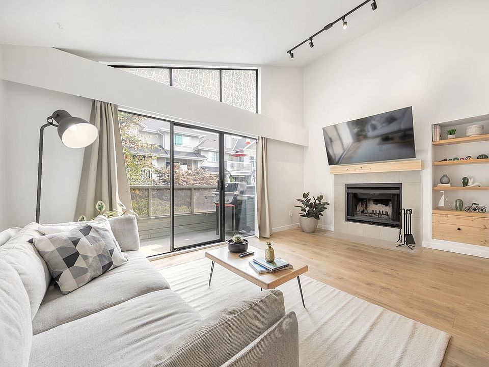 Rarely available top-floor 2-bed, 1-bath corner unit in Uptown New Westminster! This bright home features vaulted ceilings, large windows, recently installed laminate floors with modern baseboards, a stylish kitchen with granite counters and stainless steel appliances, and a cozy upgraded wood-burning fireplace. Bedrooms are set on opposite sides for added privacy, with smart lighting ready for Google or Alexa. Located on a quiet street yet steps from shops, parks, schools, restaurants, and SkyTrain. 1 parking, and 1 storage, heat included in Strata fee, modern, comfortable, and move-in ready!